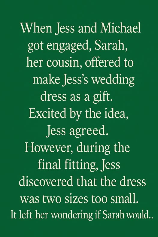 When Jess and Michael got engaged, Sarah—her cousin—offered to make Jess’s wedding dress as a gift. Jess, touched by the gesture and excited at the thought of wearing something handmade by family, happily agreed. But when the final fitting came, the dream unraveled—literally. The dress was two sizes too small, and Jess suddenly wondered if this was really a mistake, or something more sinister.