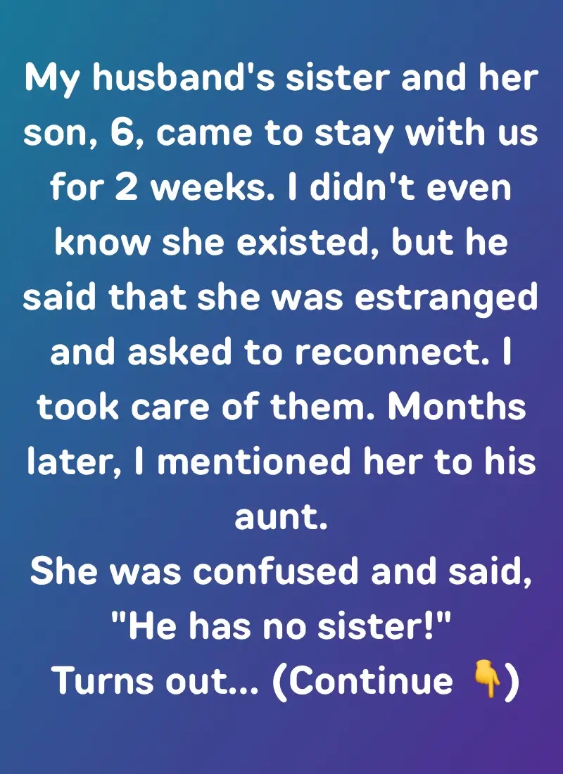 My husband’s sister and her 6-year-old son stayed with us for two weeks. After 12 years of marriage, I had no clue she existed. He explained that she was estranged and living abroad, and had recently sought to reconnect.