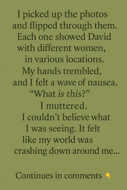 As I lifted more pieces, I found something else: a stack of photographs. My breath caught as I flipped through them. Each picture showed David—my husband—with different women. Smiling. Holding them. Kissing them.