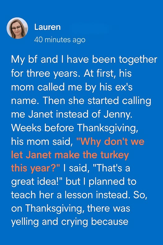 Weeks before Thanksgiving, the woman was at a barbecue at her boyfriend’s sister’s house. While chatting in the kitchen, the sister complimented her cooking. That’s when the boyfriend’s mom chimed in sarcastically:
