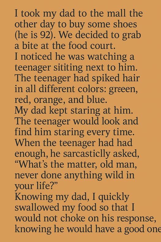 A person recently took their 92-year-old dad to the mall to pick out some new shoes. Afterward, they stopped by the food court to grab a bite.As they sat down, the dad couldn’t help but notice a teenager nearby with spiked hair dyed in every color of the rainbow—green, red, orange, blue. It was quite the sight!