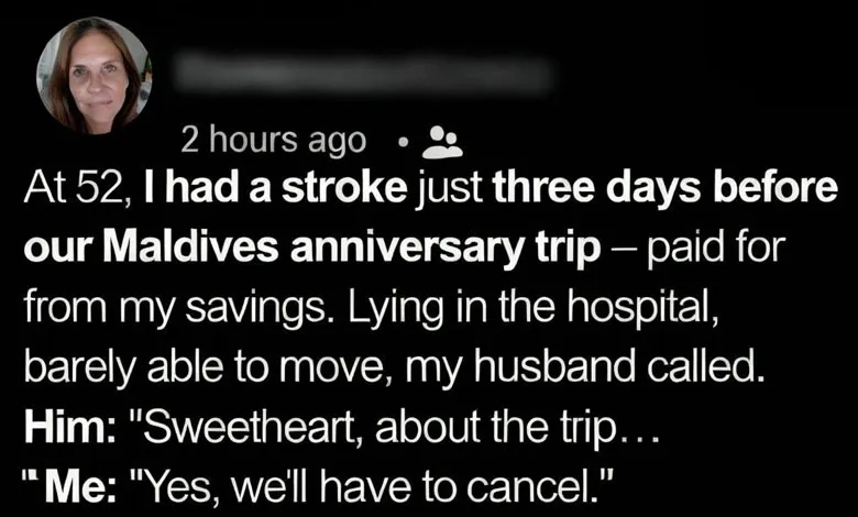 At 52, I had a stroke just three days before our Maldives anniversary trip — paid for from my savings. One moment I was folding laundry and thinking about turquoise water and quiet mornings, and the next I was waking up under bright hospital lights, my body heavy and unresponsive. The doctors spoke gently, but their words carried weight: rest, recovery, uncertainty. As I lay there, struggling to move my fingers, my phone buzzed with my husband’s name. I assumed he was worried, maybe even scared. Instead, the conversation drifted toward logistics, costs, and timing. When he explained that postponing the trip was expensive and that he didn’t want the money to go to waste, I listened in stunned silence. By the time he mentioned offering the trip to someone else, my heart sank in a way that had nothing to do with my medical condition.